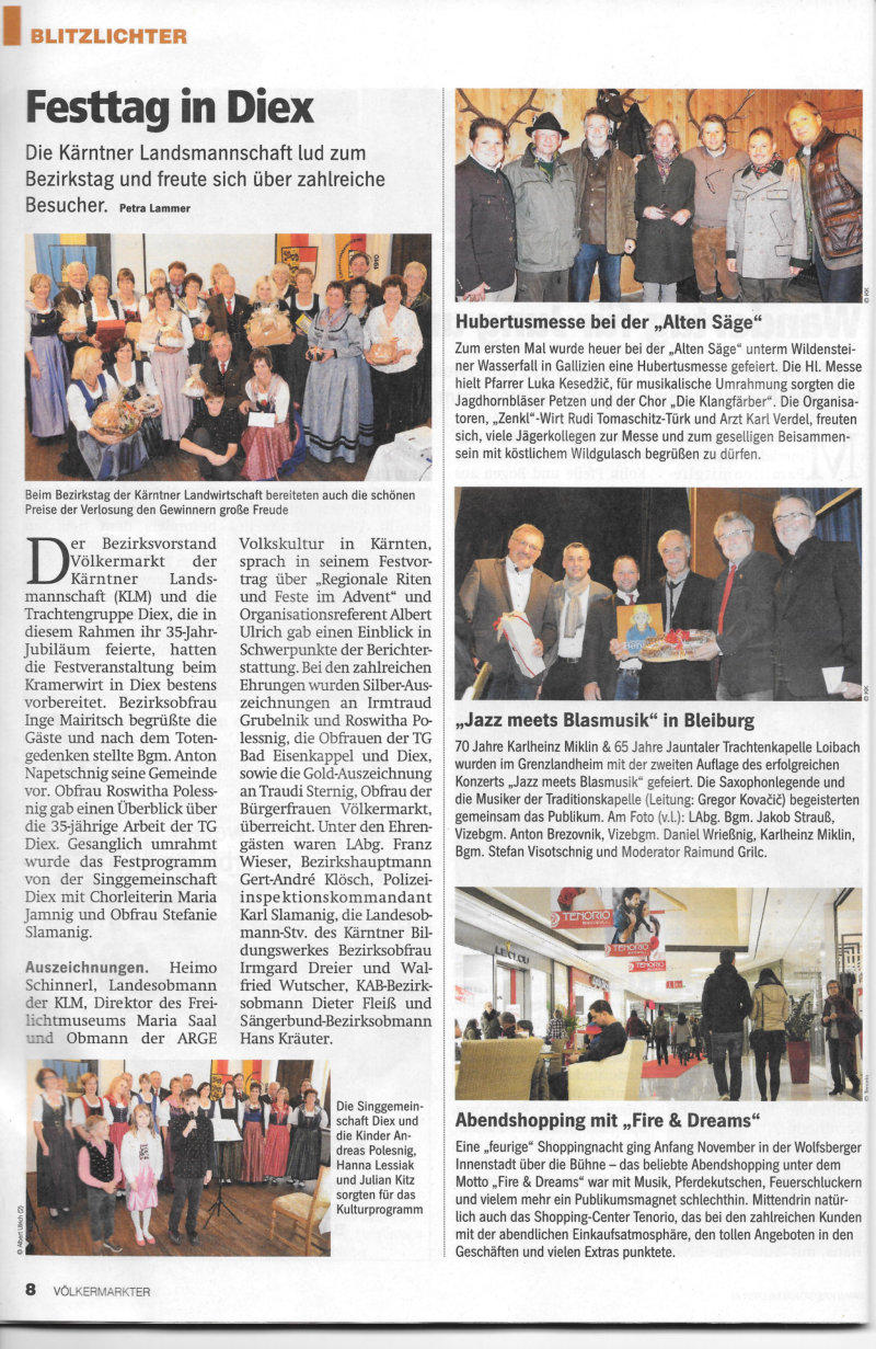 Die    Kärntner    Landsmannschaft    im    Bezirk    Völkermarkt    ist    sehr    stolz    darauf,    dass    sie    bei    ihren Veranstaltungen   auf   zahlreiche   treue   Besucher   zählen   darf.   Auch   beim      Bezirkstag,   der   am      Sonntag, dem   6.   November   2016   beim   Kramerwirt   in   Diex   gemeinsam   mit   dem   35   Jahr   Jubiläum   der   TG   Diex abgehalten   wurde,   war   es   erfreulicherweise   nicht   anders.   Bei   der   vom   Bezirksvorstand   der   KLM   und der     örtlichen     Trachtengruppe     bestens     vorbereiteten     Festveranstaltung     kamen     die     zahlreichen Besucherinnen    und    Besucher    voll    auf    ihre    Rechnung.    Mit    einem    sehr    aussagekräftigen    Gedicht eröffneten   die   Kinder   Andreas   Polesnig,   Hanna   Lessiak   und   Julian   Kitz   das   Programm.   Nach   der offiziellen   Begrüßung   durch   die   Bezirksobfrau   der   KLM   Inge   Mairitsch   und      dem   Totengedenken      stellte Herr   BGM   Anton   Napetschnig   auf   sehr   ansprechende   Art   seine   Gemeinde   vor,   danach   dokumentierte die   Obfrau   der   TG   Diex   Roswitha   Polessnig   mit   einem   aussagekräftigen   Videofilm   die   reichhaltige   35 Jahre   andauernde   kulturelle,   gemeinschaftsfördernde   und   karitative   Arbeit   der   jubilierenden   TG   Diex. Mit   sehr   einfühlsamen   Liedern   umrahmte   die   Singgemeinschaft   Diex   unter   der   Leitung   von   Jamnig Maria   (Obfrau Slamanig Stefanie) das Festprogramm. Für    den    Höhepunkt    des    Bezirkstages    sorgte    aber    Dr.    Heimo    Schinnerl    (Obmann    der    Kärntner Landsmannschaft,   Direktor   des   Kärntner   Freilichtmuseums   Maria   Saal,   Obmann   der ARGE   Volkskultur in Kärnten) mit seinem Festvortrag über „Regionale Riten und Feste im Advent“. Das   Publikum   war   begeistert,   zumal   es   dem   Festredner   auf   sehr   verständliche   Art   gelang,   bekanntes Brauchtum   zu   durchleuchten   und   aufzuzeigen,   dass   gar   manches   Fest   und   viele   Riten   aus   einem gesamteuropäischen   Blickwinkel   zu   betrachten   sind.   Organisationsreferent   Albert   Ulrich   ermöglichte den Besuchern einen Einblick in die Schwerpunkte der Berichterstattung in der slowenischen Presse. In   ihren   Grußadressen      würdigten   LAbg.   Franz   Wieser,   BH   Mag.   Gert-Andrä   Klösch   und      LO   Dr.   Heimo Schinnerl die Arbeit der unzähligen Mitarbeiter und Mitarbeiterinnen der     Kärntner     Landsmannschaft und wiesen auf die Notwendigkeit und Verpflichtung auch unserer   Generation   hin,   einen   Beitrag   für   die Erhaltung von Bewährtem beizutragen und offen für Neues zu sein. Es   folgten      zahlreiche   Ehrungen   von   Gemeinden   und   verdienten   Persönlichkeiten   der   KLM.   Allen   sei herzlichst   gratuliert.   Besonders   freut   uns   die   Auszeichnung   für   die   Obfrauen   der   TG   Bad   Eisenkappel und   Diex      Irmtraud   Grubelnik      und   Roswitha   Polessnig   (Silber)   und   für   die   Obfrau   der   Bürgerfrauen Völkermarkt Traudi Sternig (Gold). Sie gehören zu den Säulen unserer Gemeinschaft. Mit    dem    Singen    der    1.    und    4.    Strophe    des    Kärntner    Heimatliedes    endete    der    offizielle    Teil    des Bezirkstages   und   ging   mit   der   Verlosung   der   von   den   Mitgliedsgruppen   und   Gönnern   gestifteten   Preise nahtlos   in   den   gemütlichen   Teil   über.   Die   von   der   TG   Diex   vorbereiteten   Brötchen,   Kuchen   und   div. Bäckereien fanden reißenden Absatz.     Die   zahlreichen   Ehrengäste   fühlten   sich   jedenfalls   bei   diesem   Fest   der   KLM   sichtlich   wohl:   BH   Mag. Gert-Andrä Klösch,   Bgm. Anton   Napetschnig,   Chefinspektor   -   PI   Völkermarkt   Karl   Slamanig   ,   LAbg. KR    Franz        Wieser,        LO    Stv.    D.KBW    Präs.    i.    R.    Walfried    Wutscher,    Bezirksobfrau    des    Kärntner Bildungswerkes Irmgard Dreier,  KAB  BO Dieter Fleiß,  BO des Kärntner Sängerbundes Hans Kräuter.