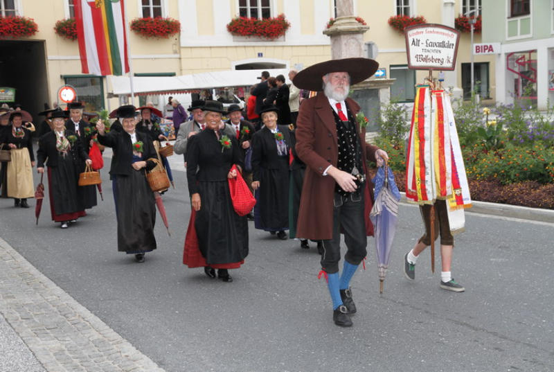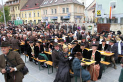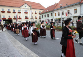 Die Abstimmungsstadt Völkermarkt war diesmal Schauplatz des Landestrachtentreffens der Kärntner Landsmannschaft, zu dem Gruppen aus allen Tälern Kärntens den Weg hierher gefunden hatten. Die Festmesse als feierlicher Auftakt wurde von Stadtpfarrer Pater Wolfgang Gracher gelesen. Er verstand es sehr einfühlsam auf das Thema Tracht einzugehen und betonte in seiner Predigt, dass die Tracht äußerer Ausdruck dessen sei, was man innerlich empfinde. Es brauche Menschen, die es für notwendig erachten Werte zu leben und dies auch nach außen hin zeigen. Die Kirchenchöre von St. Ruprecht und St. Franzisci umrahmten gesanglich die Festmesse. Am Festzug nahmen zirka 60  Gruppen, sowie sechs Festwägen und eine Abordnung der Feuerwehr mit alten Geräten teil. Besonders erfreulich war, dass beim Festzug nahezu alle Kulturvereine aus dem Bereich Völkermarkt mitgemacht haben, auch solche, die nicht der KLM angehören. Unter den Klängen des Musikvereins Haimburg und der Lindendorfer Bauernkapelle ging es durch die Stadt, wo viele Schaulustige den Weg des Trachtenzuges säumten. Das anfänglich noch trübe Wetter sollte im Verlauf der Veranstaltung zu einem wahrhaft herrlich sonnigen Herbsttag werden. Bei der Feierstunde am Festplatz wussten alle Redner das Trachtentreffen und im Speziellen das Tragen der vielfältigen Talschaftstrachten zu würdigen. Der Bürgermeister der Abstimmungsstadt Völkermarkt,  Valentin Blaschitz, brachte in seiner Rede zum Ausdruck, dass er dieses Fest als Symbol der Gemeinschaft und der Freude an der Pflege heimatlicher Werte sehe. Tracht im Besonderen ist ein Teil davon und als volkskultureller Wert sind die Bewahrung unserer traditionellen Trachten und deren Pflege sehr wichtig. Die Tracht ist ein Ausdruck des Zusammengehörigkeitsgefühls und der heimatlichen Identität. Bürgermeister Valentin Blaschitz und seiner Stadt ist an dieser Stelle auch zu danken für die große Hilfe bei der Vorbereitung und Durchführung des diesjährigen Landestrachtentreffens.  Landesobmann Dr. Heimo Schinnerl wies auf das stete Bemühen der Kärntner Landsmannschaft hin, sich auf der Basis ihrer über 100jährigen Geschichte um die Erhaltung und Pflege unserer heimatlichen Volkskultur in allen deren Facetten zu kümmern. Er dankte allen Gruppen, ganz besonders jenen, die sich auch am nachmittäglichen Kulturprogramm beteiligten. Ebenso dankte er der Stadt für die positive Zusammenarbeit und großzügige Unterstützung. Grußworte an die zahlreich erschienenen Gäste richteten auch 1. Landtagspräsident Josef Lobnig, 2. Landtagspräsident Rudolf Schober sowie Bezirkshauptmann Mag. Gert Klösch. Unter den Ehrengästen zu sehen waren u. a. weitere Vertreter der Stadtgemeinde, LAbg. Franz Wieser, Ehrenobmann Ing. Sepp Prugger, Univ.-Prof. Dr. Gernot Piccottini, Prof. Walter Kraxner und Ewald Opetnik vom Kärntner Heimatwerk, die Präsidentin des Landesverbandes der Städtischen Bürger- und Goldhaubenfrauen Kärntens Monika Plieschnegger sowie DI Karl-Heinz Moschitz, der Vorsitzende der Volksdeutschen Landsmannschaften. Das Kulturprogramm gestalteten die Stadtkapelle Völkermarkt, der Singkreis Völkermarkt, der MGV Scholle-Haimburg/St. Peter, der MGV Wiegele/Gattersdorf, die Volkstanzgruppe der Landjugend St.Stefan/Haimburg und die Plattlergruppe "Springende Böcke" der Landjugend Diex. Der Filmclub Völkermarkt hat das ganze Fest in Bild und Ton festgehalten. Erich Pfeifenberger hat sowohl den Festzug sachkundig kommentiert als auch sehr schwungvoll das Nachmittagsprogramm moderiert.   Allen TeilnehmerInnen und Gästen ist an dieser Stelle zu danken, haben sie doch einmal mehr die hohe volkskulturelle Bedeutung unserer vielfältigen Talschaftstrachten unterstrichen.  ISCH/JE Weiter Zurück