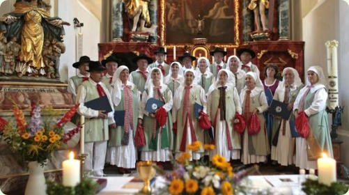 Die Männer tragen weiße Leinenhemden und -Hosen, darüber grüne ärmellose Gehröcke und rote Krawatten, dazu schwarze Hüte. Die Frauen haben weiße Leinenblusen mit Spitzenkrägen, weiße Leienenröcke und darüber hell- grüne, ärmellose Gehröcke. Weiße, bestickte Kopftücher und rote Borten als Schleifen vorne ergänzen diese historische Tracht.