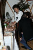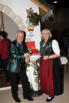Lange Jauntaler Festtracht in Seide. Das Oberteil in Spenserform mit den zwei typischen Samtbändern um den Ausschnitt, der Rock hat drei Samtbänder über dem Saum. Dazu tragen die Damen die Rosentaler Bodenhaube mit schwarzen Bändern.